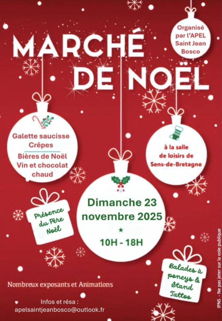 L’Apel de l’école organise un marché de Noël le dimanche 23 novembre à la salle des loisirs de Sens de Bretagne. Venez y faire un tour pour déguster une crêpe ou réaliser vos emplettes de Noël. N’hésitez pas à en parler autour de vous! Le père Noël sera présent.